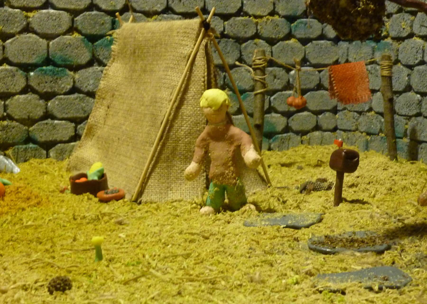 Short film created with the stop motion technique as a final project of the Visual Communication II subject in the last year of the institute (6th) 2014. Using different materials to create the scenery, it took me a day to build it. Basically, the stage where the events occur is made of Styrofoam and the bricks are carved into the latter. The grass is composed of sawdust mixed with green dye, most of the elements that accompany the scene are made of colored plasticine, cold porcelain, burlap, sticks, ropes, wire, cotton, and oregano. The objects are also painted with acrylics like the bricks on the wall.