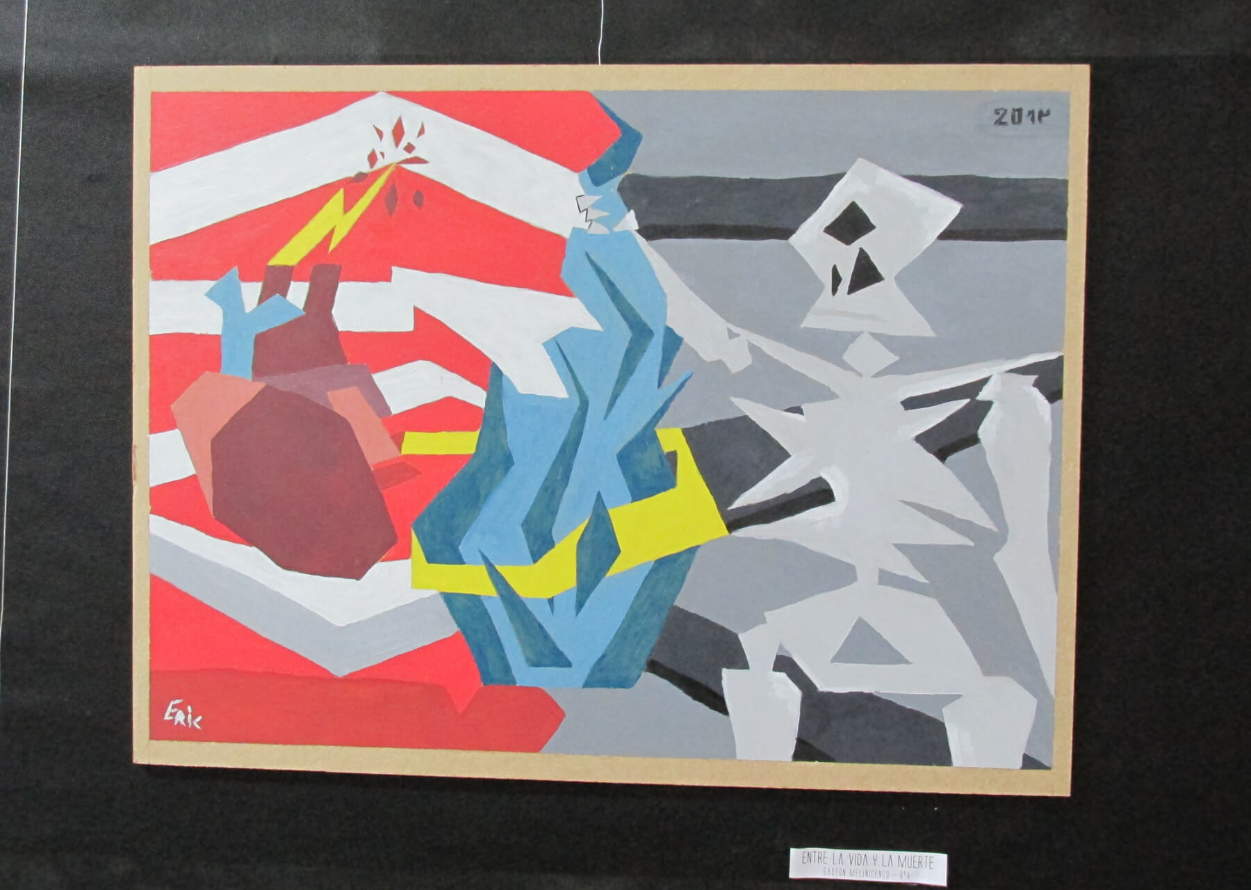 “Entre la Vida y la Muerte” es mi mejor cuadro creado cuando iba al instituto en el año 2014 para la materia Arte y Comunicación Visual II. El ejercicio consistía en sintetizar formas para crear algo cubista. Para hacer esta obra descompuse un corazón, fuego, y esqueleto humano.