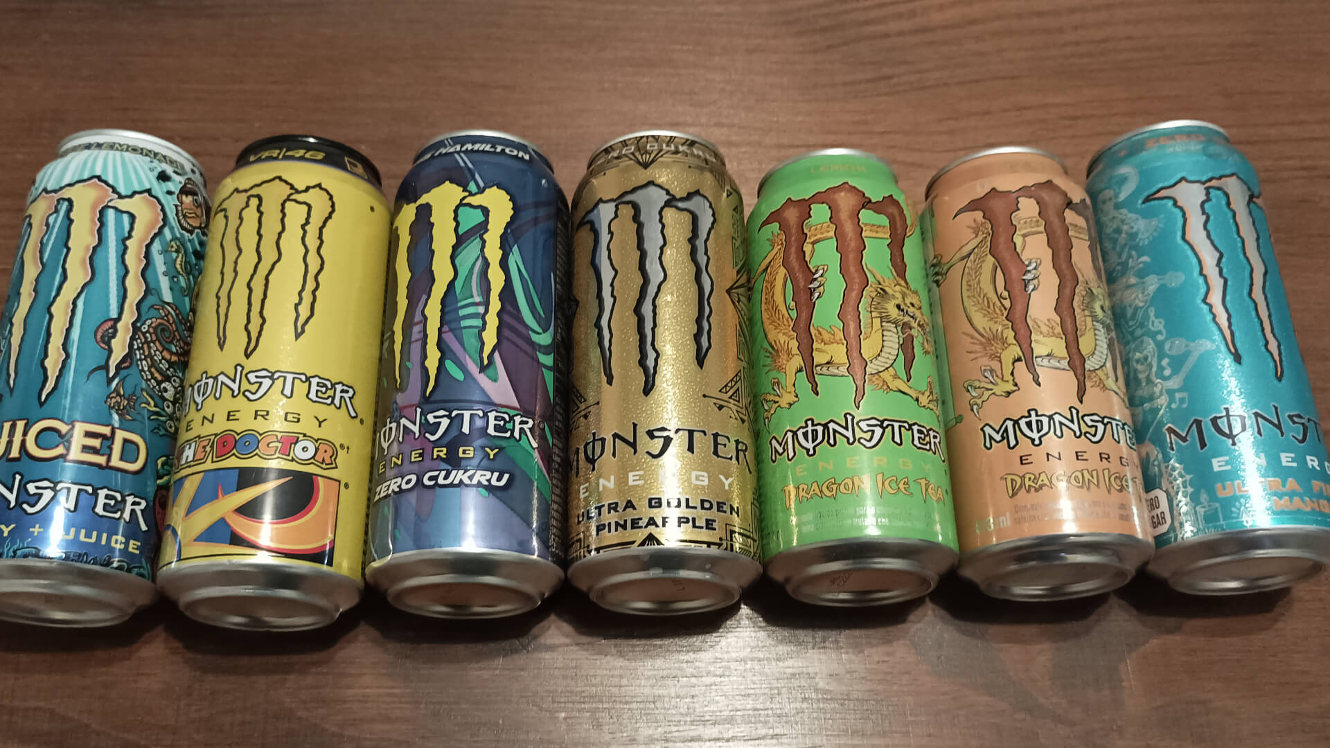 First, I bought different cans of Monster energy drink (since where I live there aren’t many flavors) at a duty-free shop, 7 different flavors.