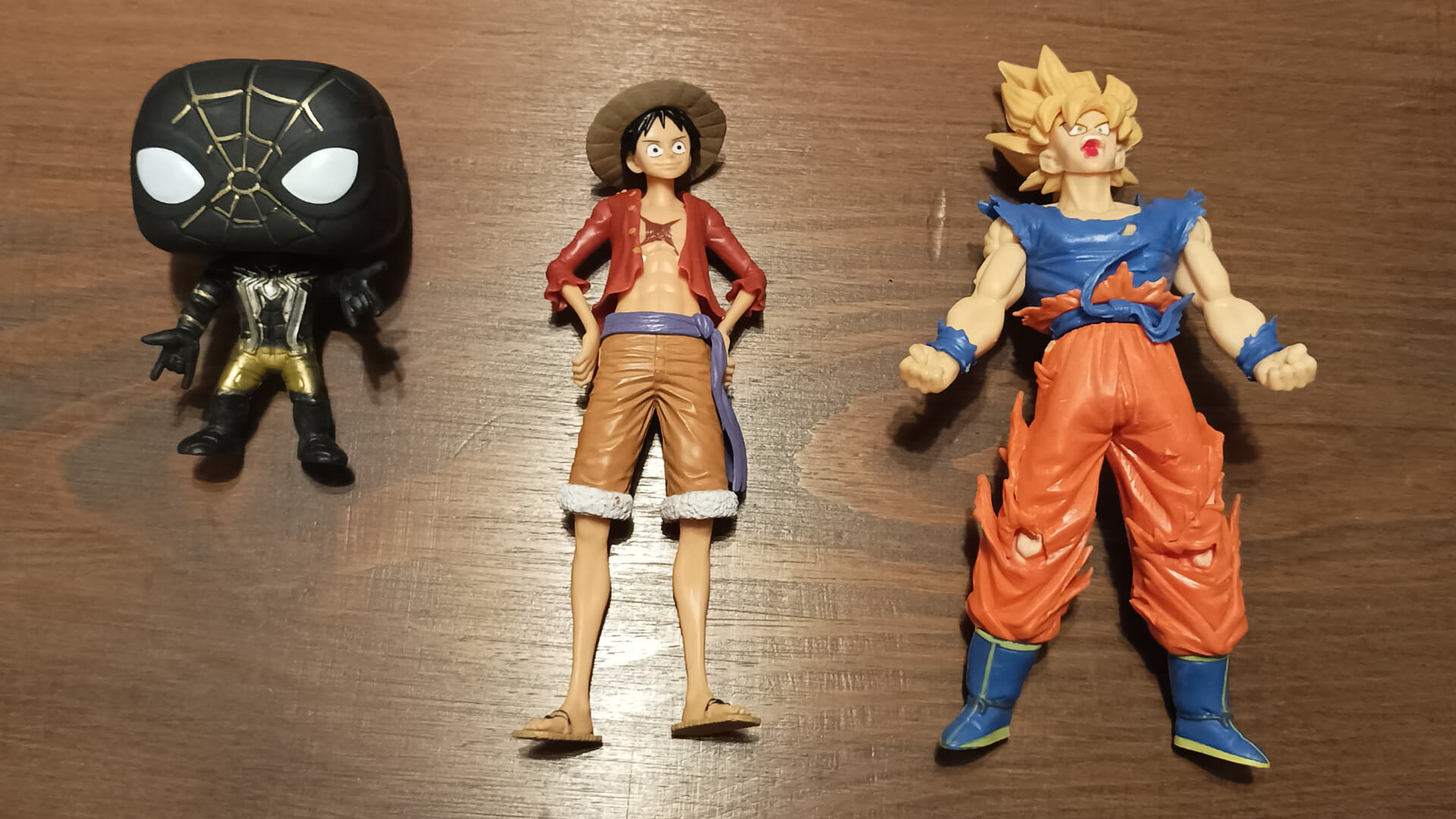 Una figura de Goku Súper Saiyajin de Dragon Ball, otra de Luffy de One Piece, y por último un Funko Pop de Venom.