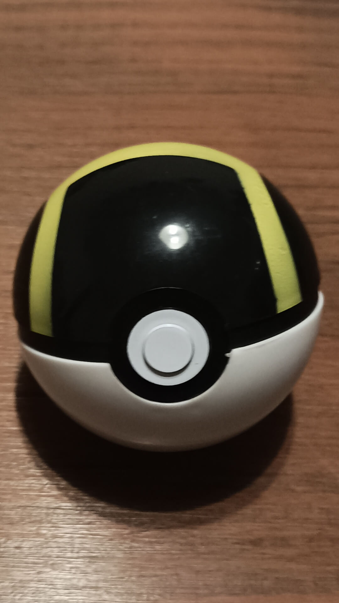 Una Ultra Ball que contenía una figura de Pikachu y una carta de Meowth.