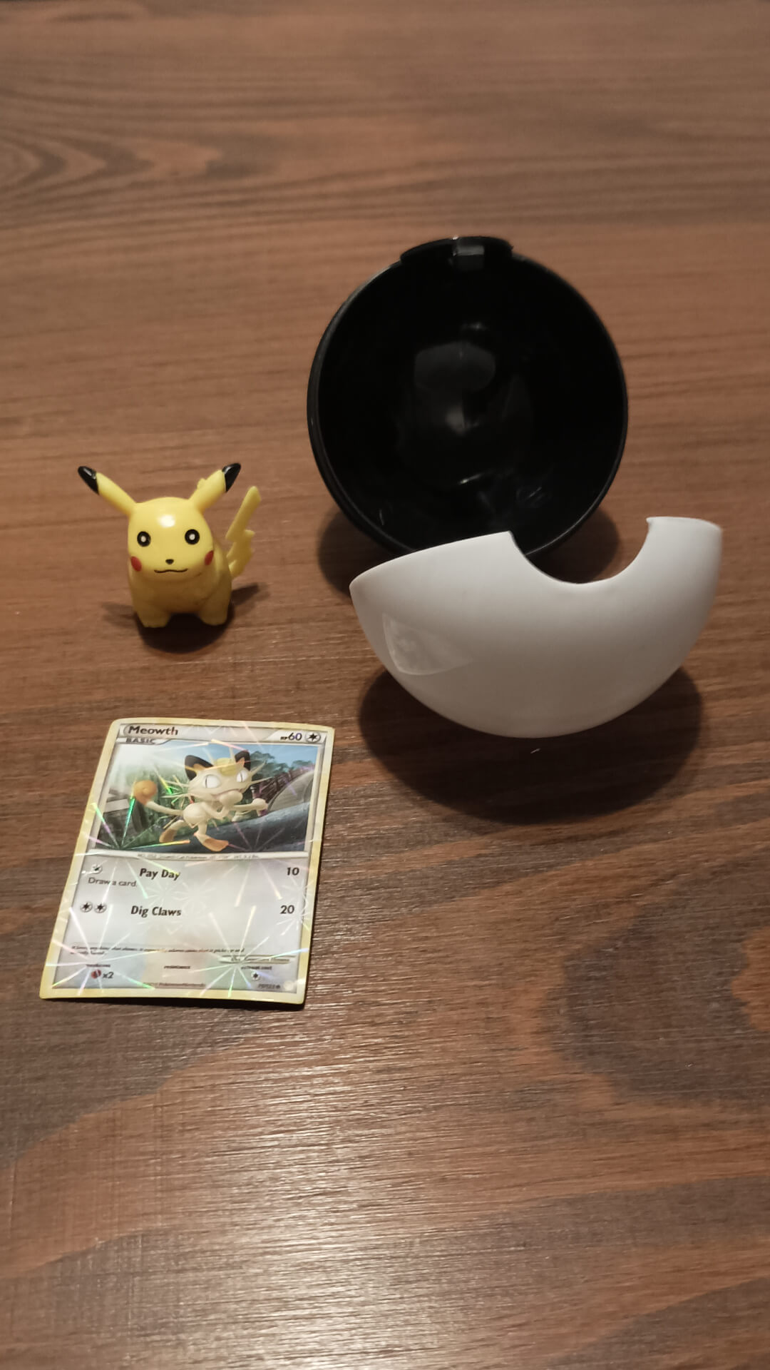 An Ultra Ball that contained a Pikachu figure and a Meowth card.