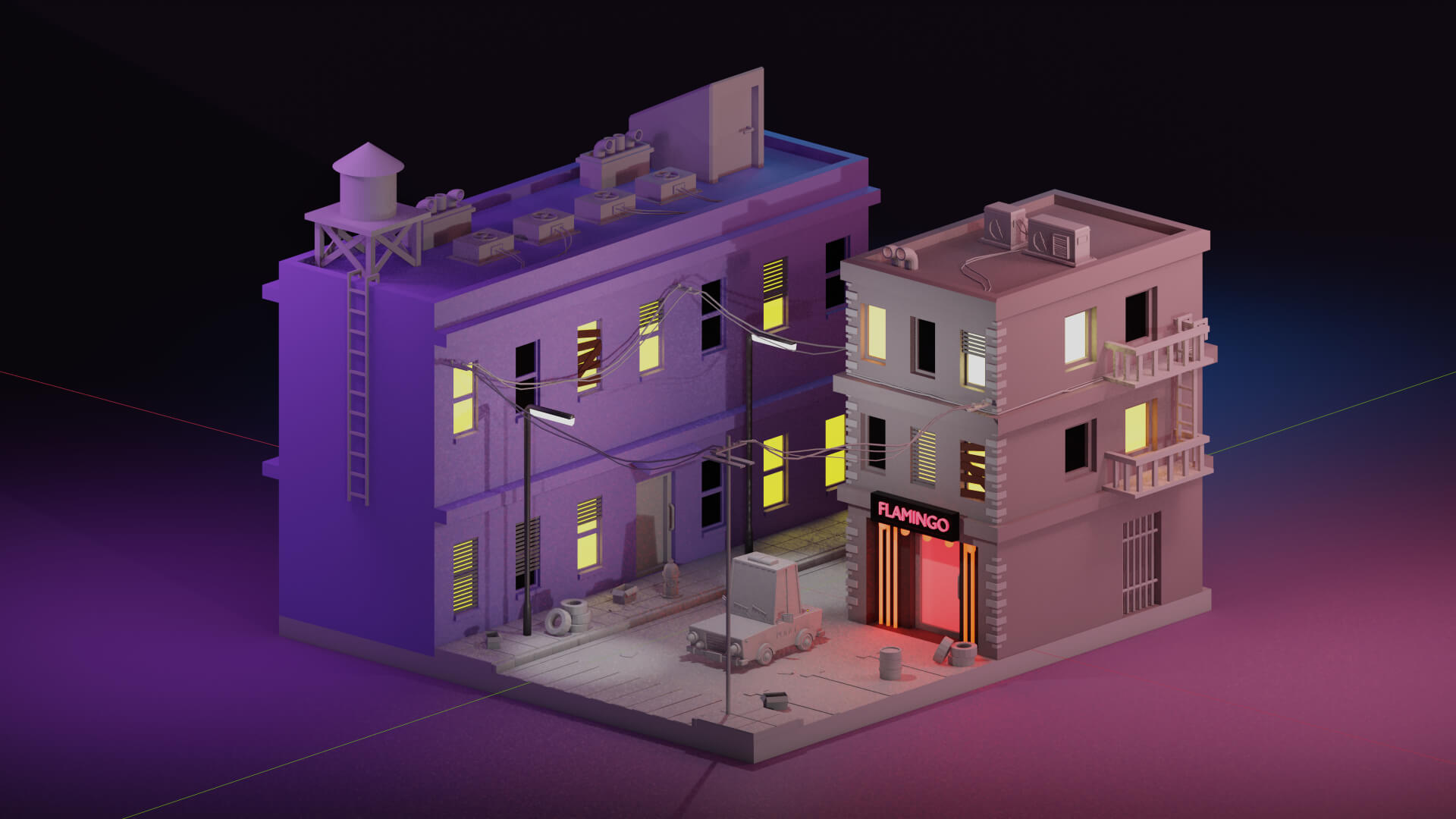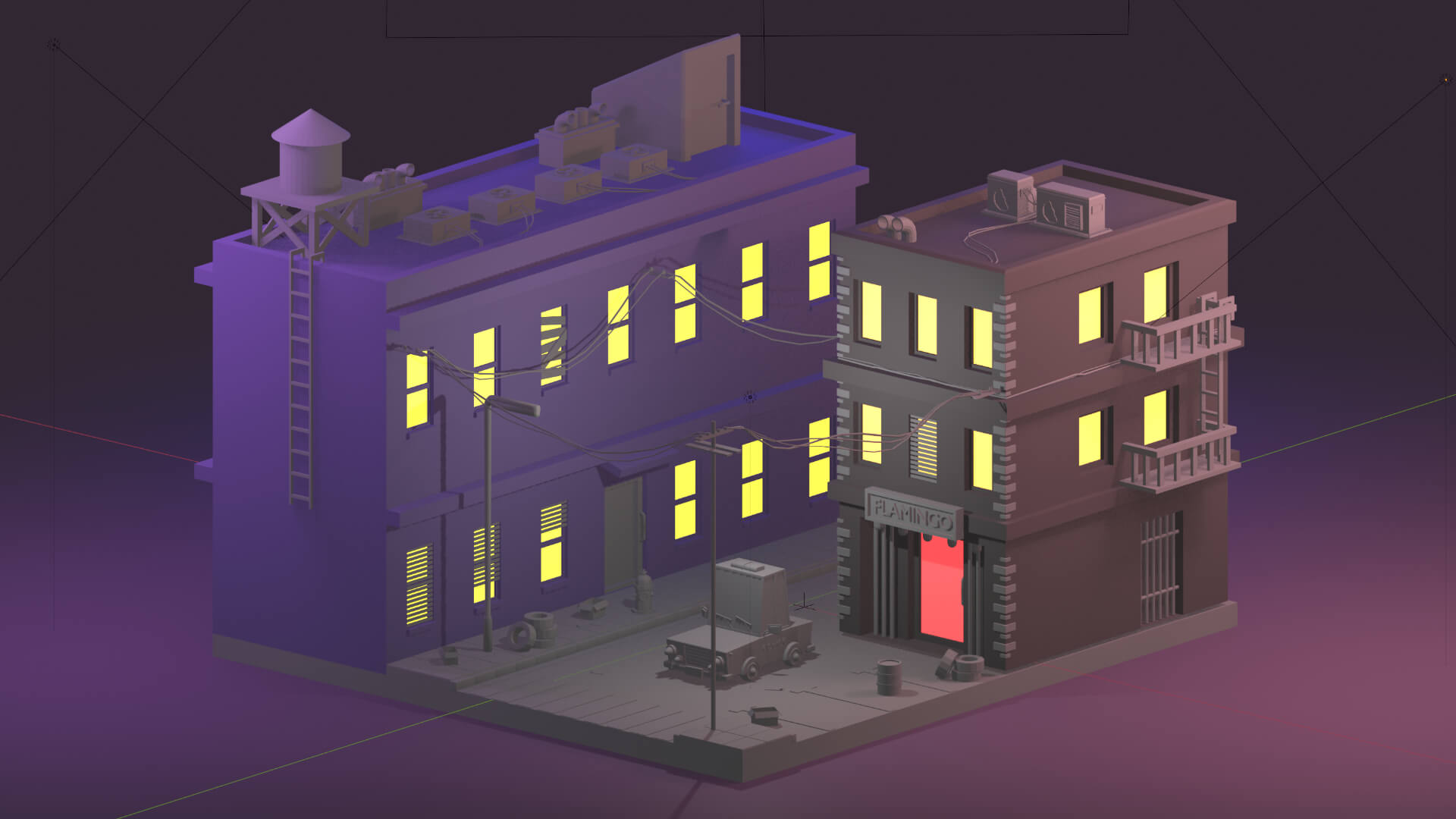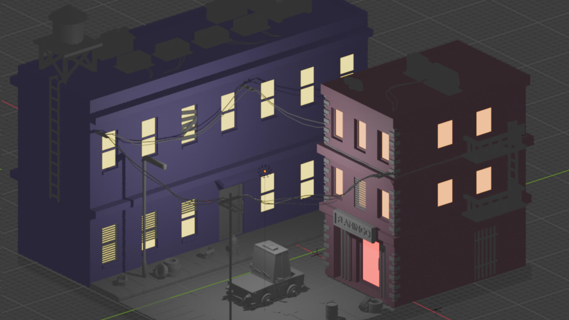 Octavo avance del curso, esta vez trabajé muy duro estos días haciendo los materiales e iluminación para el diorama nocturno, incluyendo los edificios, ventanas, objetos, farolas, el letrero del edificio, el auto, etc.
