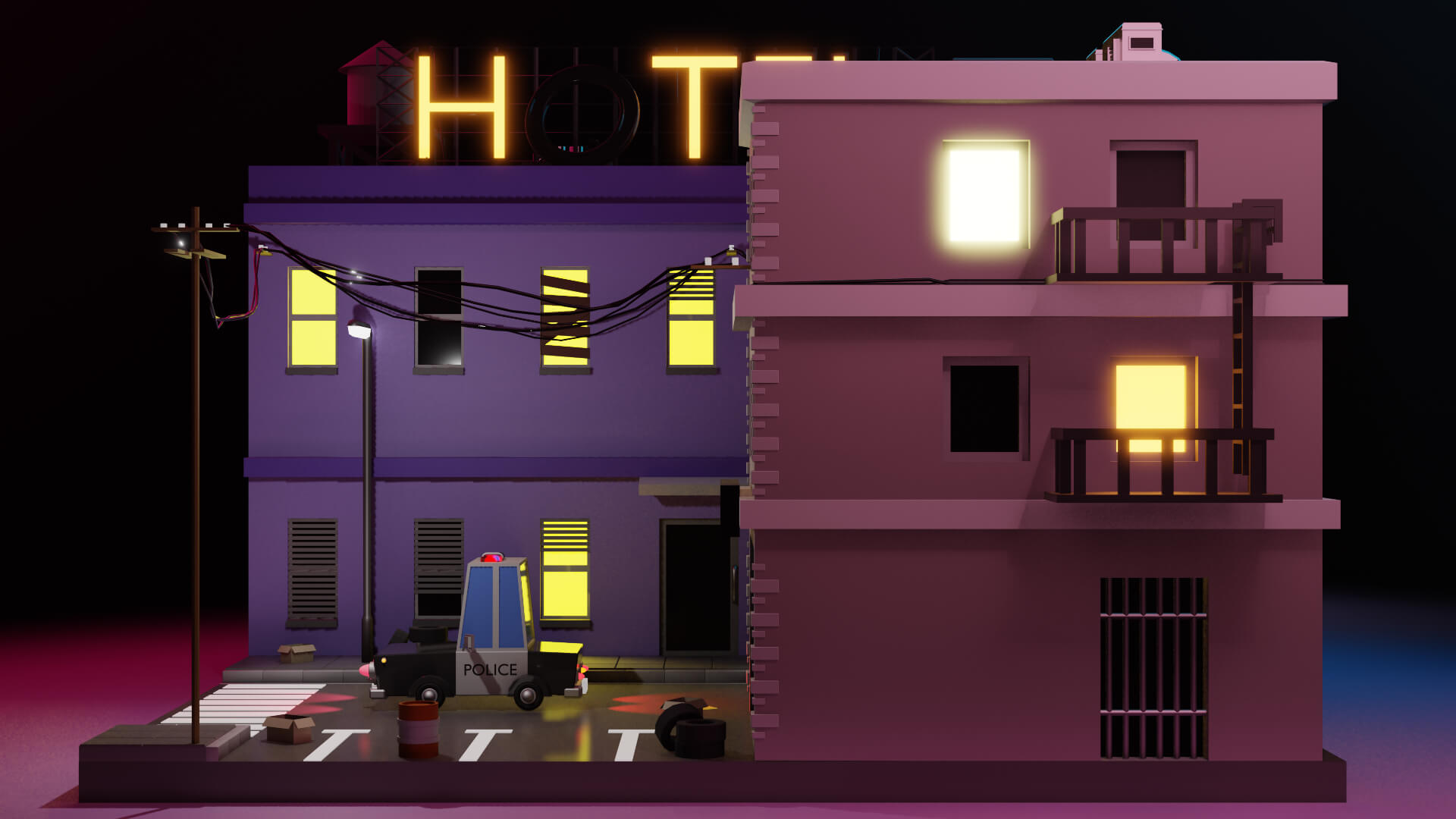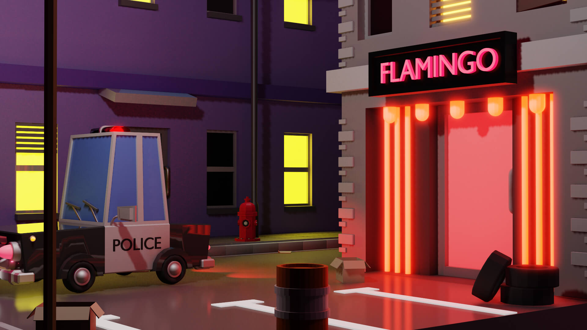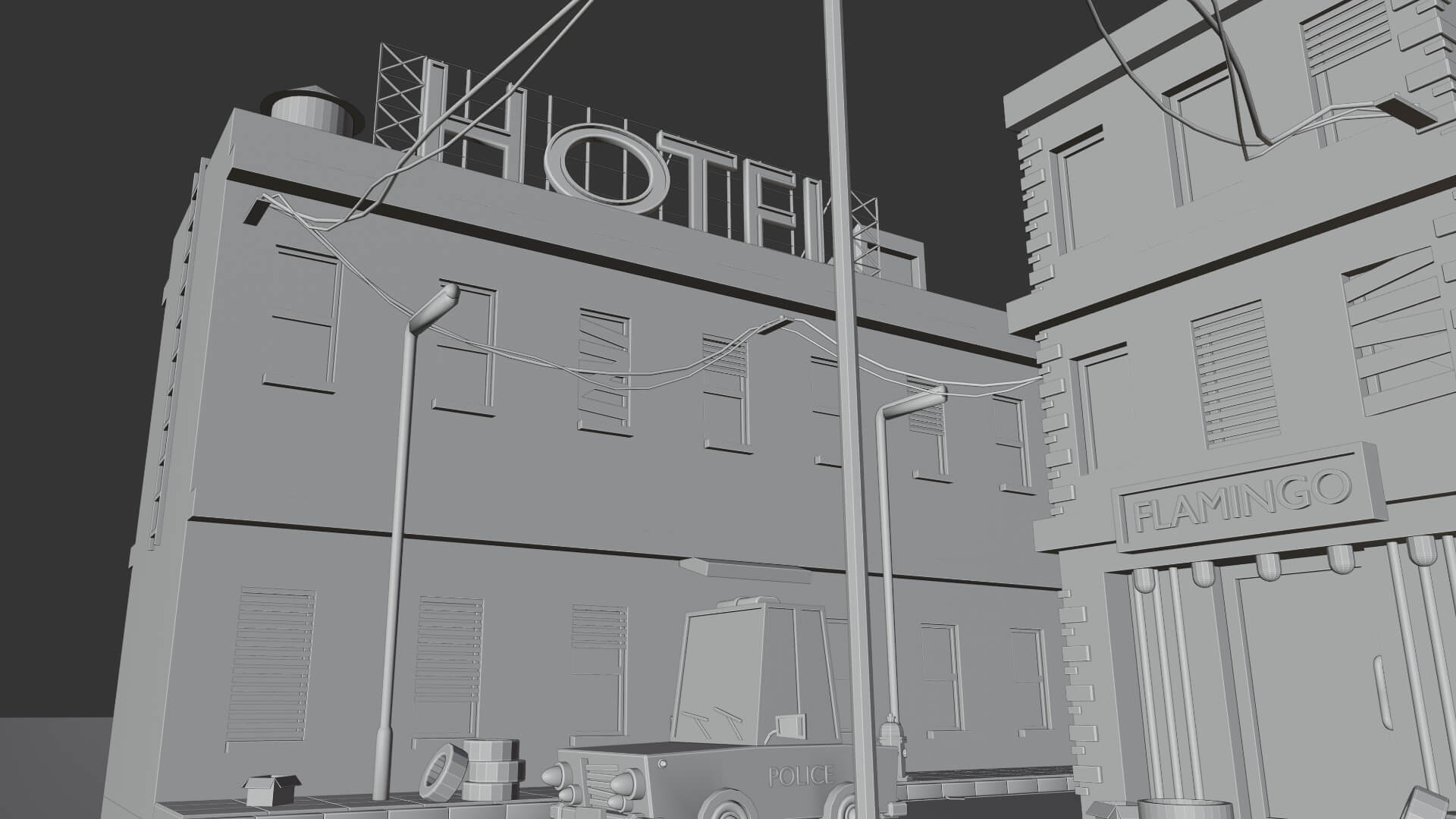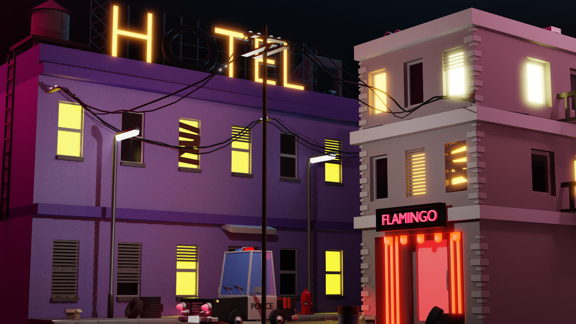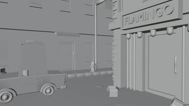Este escenario nocturno representa una pequeña parte de una ciudad, un poco descuidada, con papeles y cajas en la calle, un club nocturno y un cartel de hotel grande con la letra O apagada. Un barrio complicado, pero por suerte con oficiales cerca para controlarlo, como es el caso de la patrulla de policía que se puede observar.