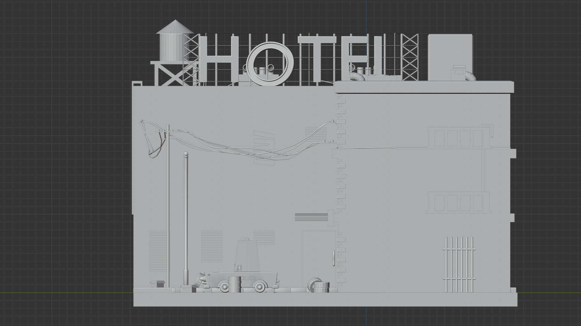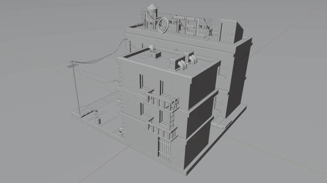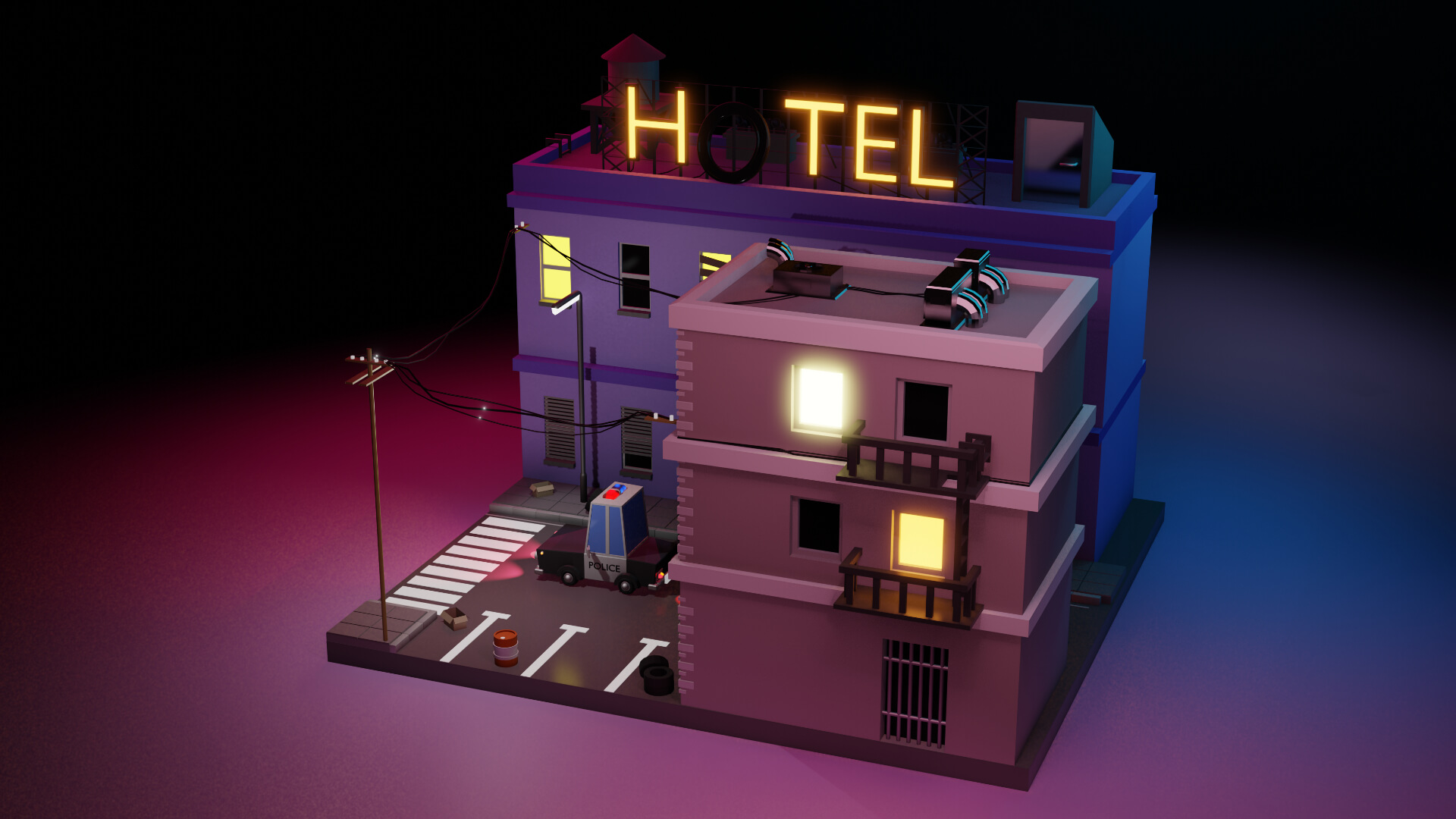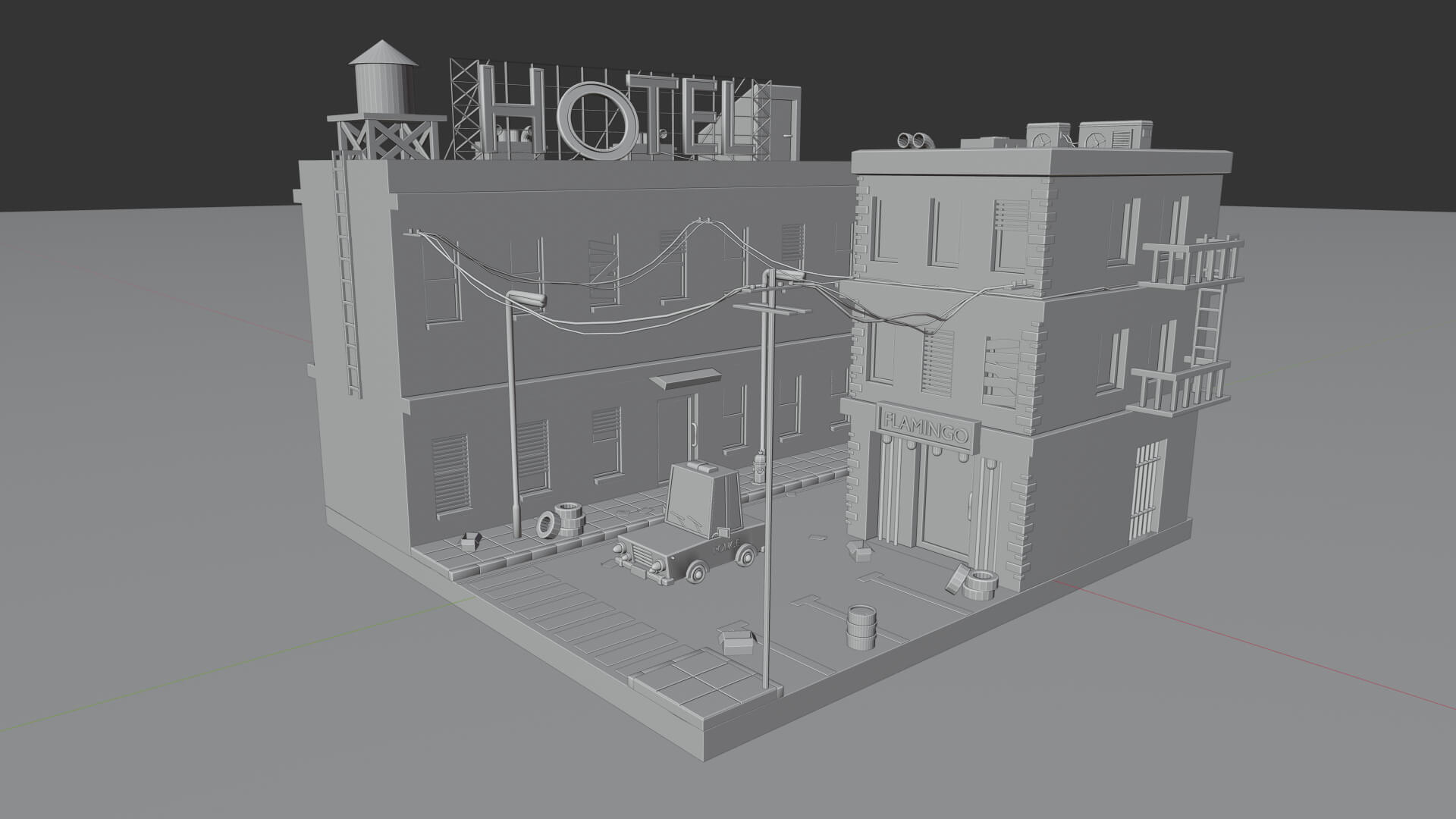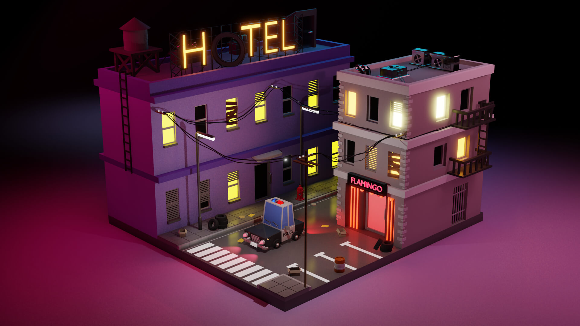 Este escenario nocturno representa una pequeña parte de una ciudad, un poco descuidada, con papeles y cajas en la calle, un club nocturno y un cartel de hotel grande con la letra O apagada. Un barrio complicado, pero por suerte con oficiales cerca para controlarlo, como es el caso de la patrulla de policía que se puede observar.