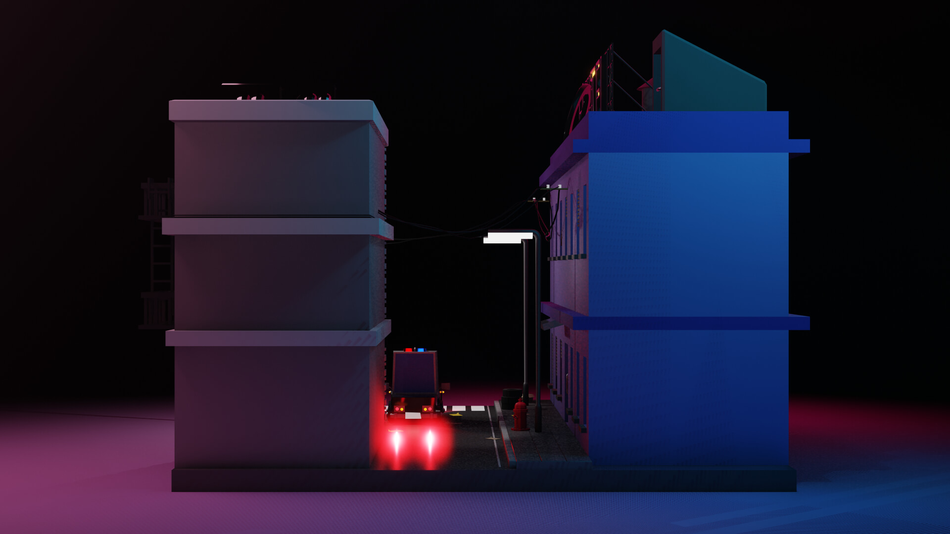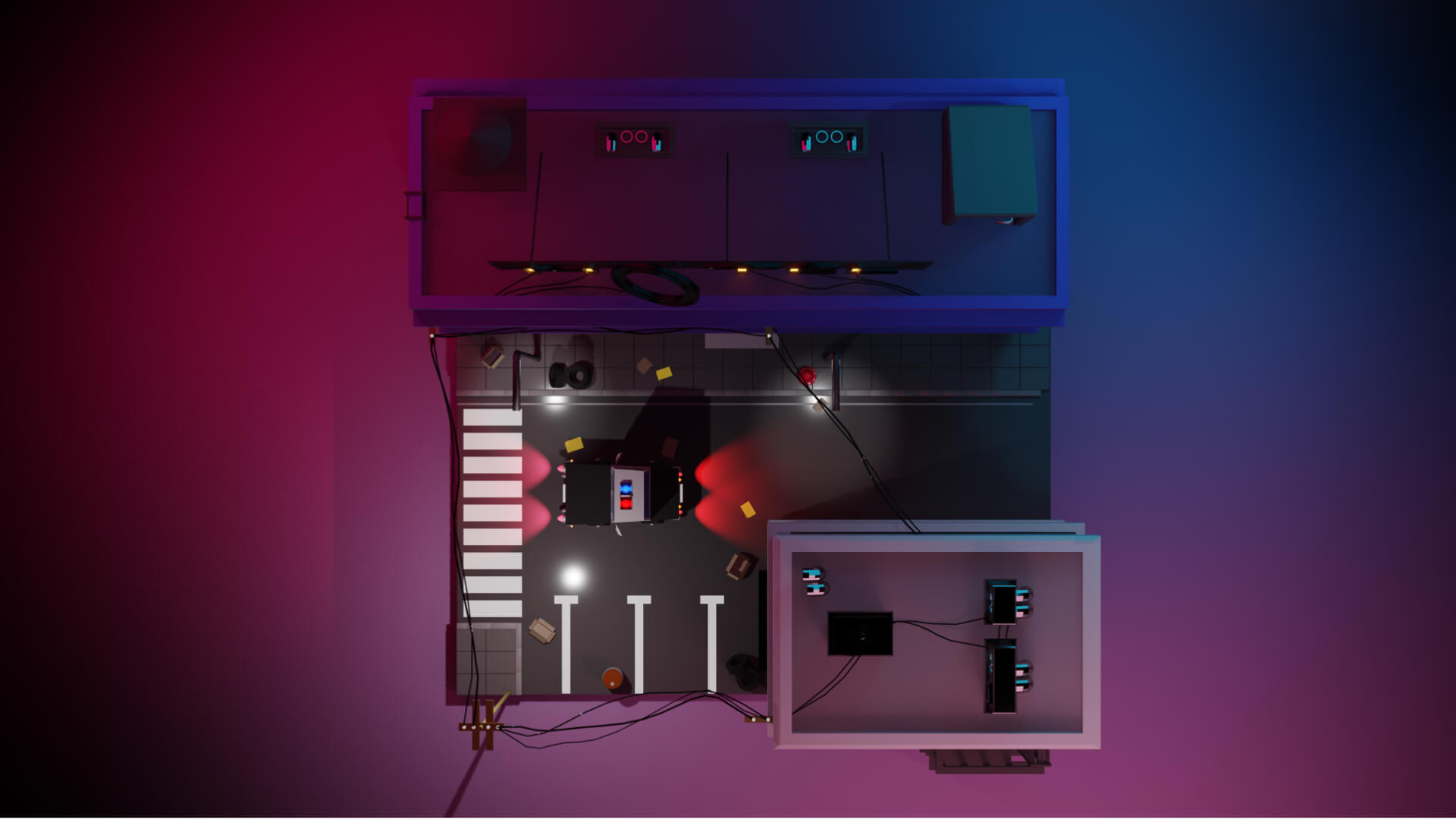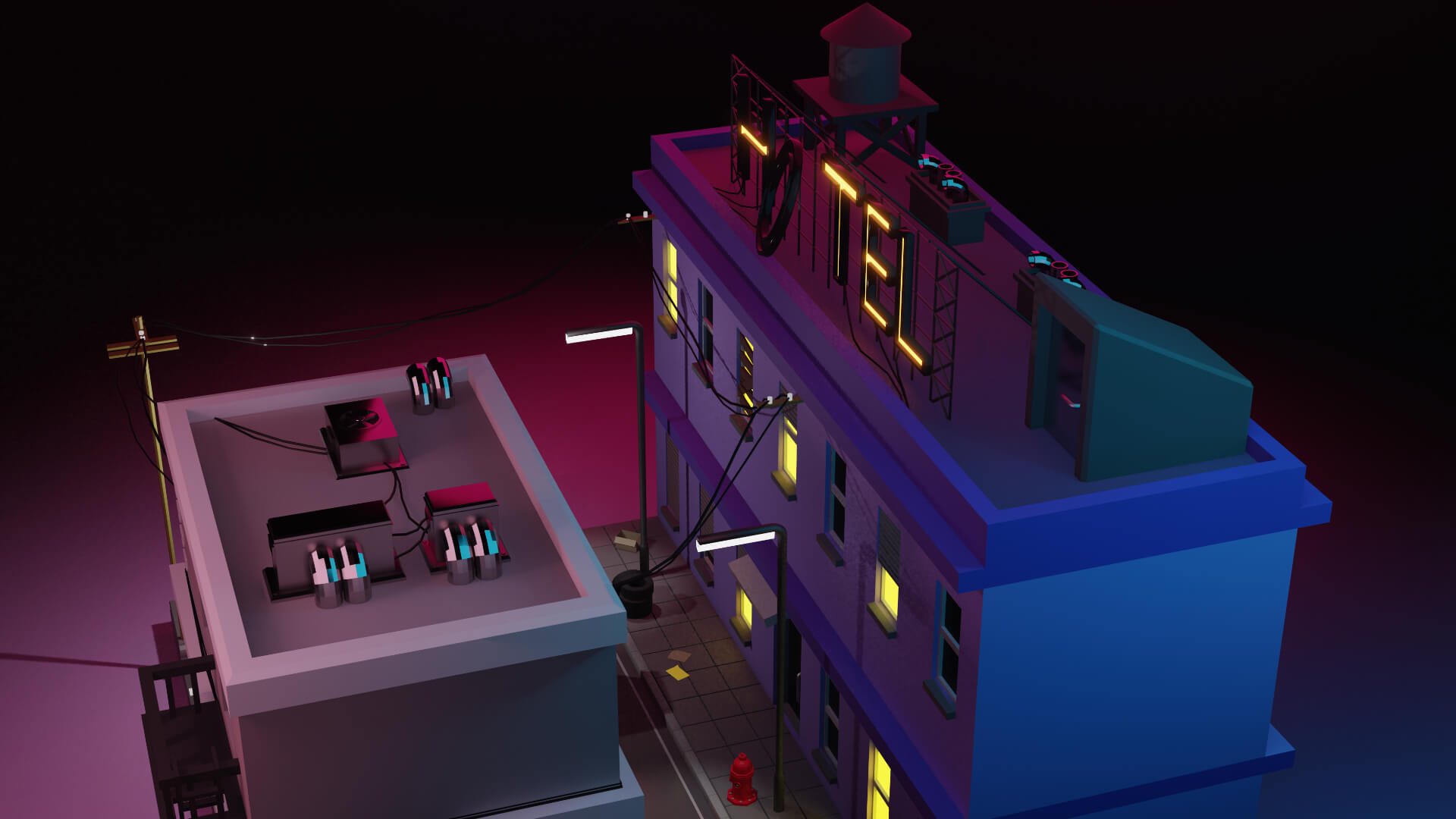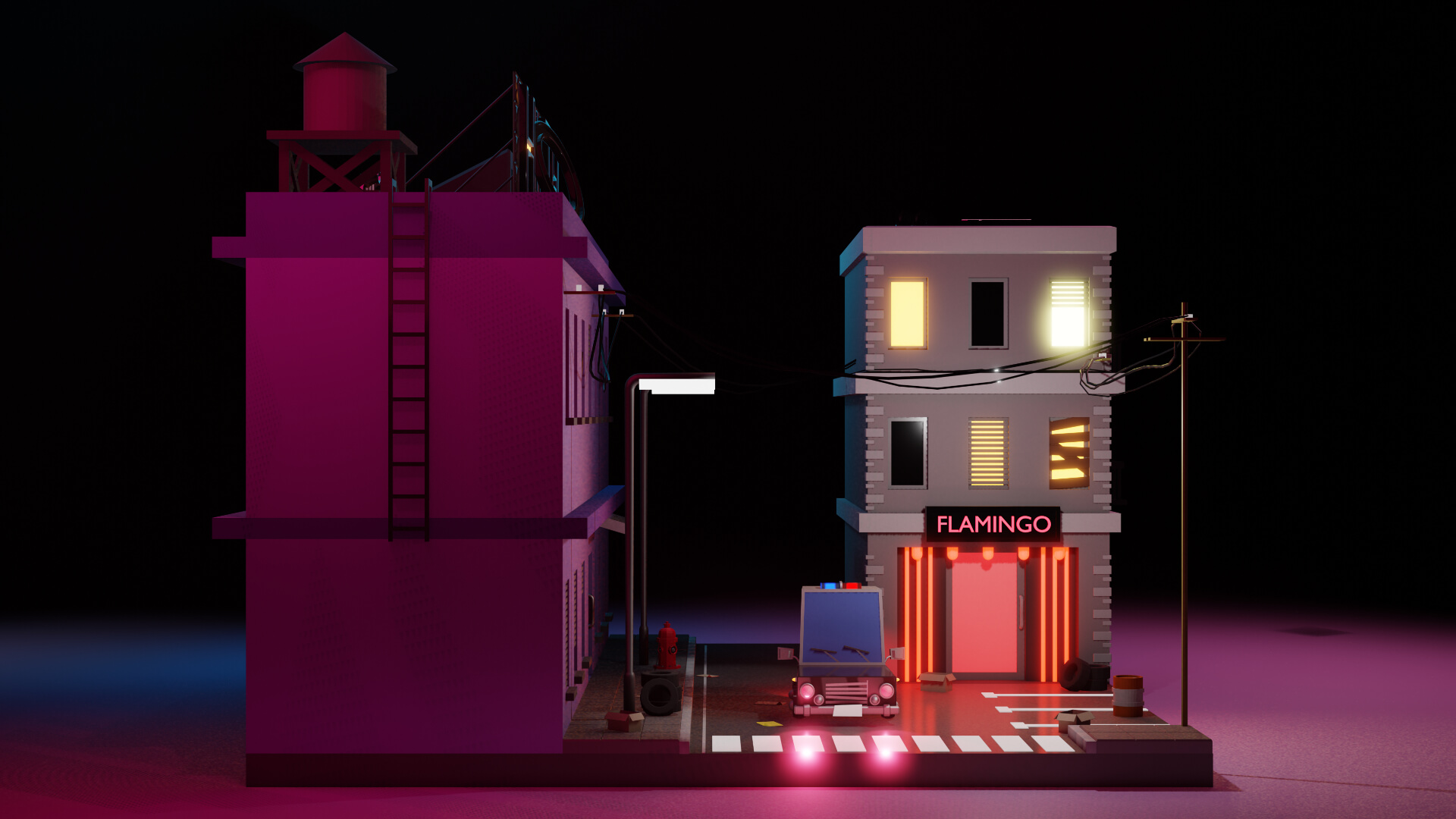 Este escenario nocturno representa una pequeña parte de una ciudad, un poco descuidada, con papeles y cajas en la calle, un club nocturno y un cartel de hotel grande con la letra O apagada. Un barrio complicado, pero por suerte con oficiales cerca para controlarlo, como es el caso de la patrulla de policía que se puede observar.
