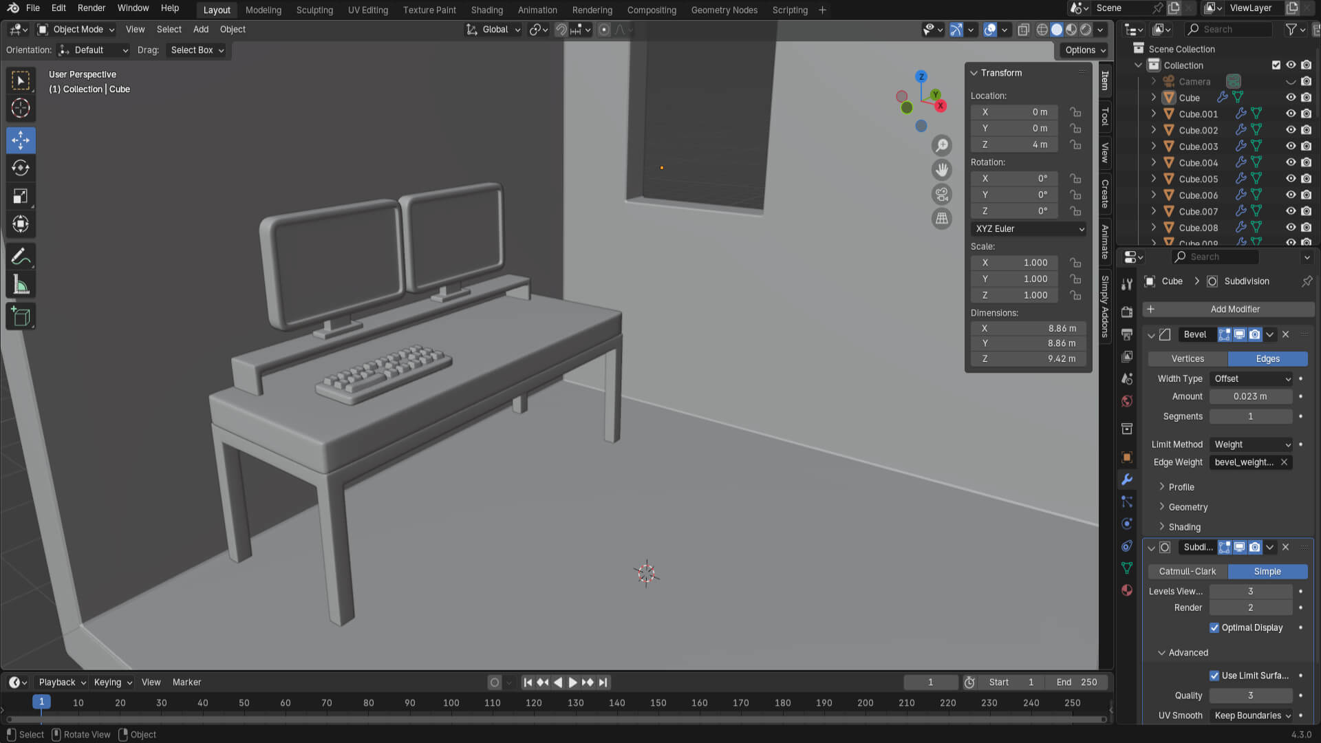 This is the beginning of a new design adventure! This time I started modeling the room with walls, the window hole, and the desk with monitors and keyboard.