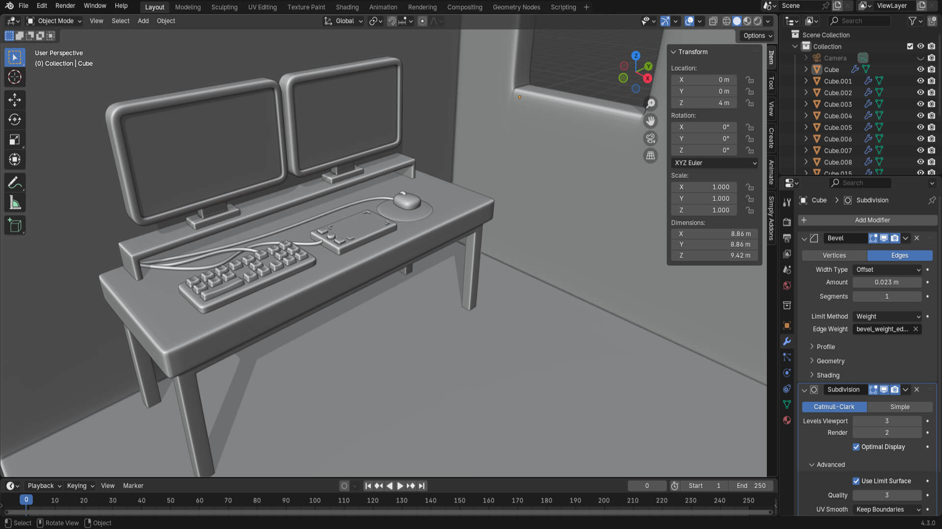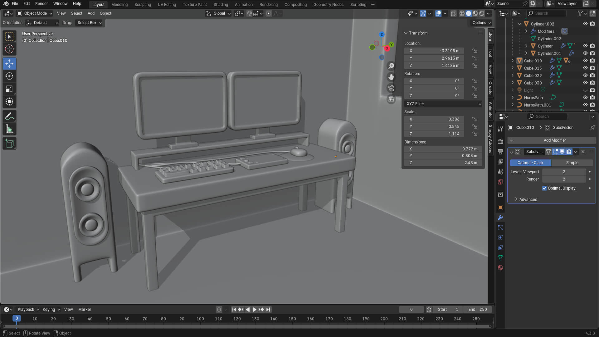 Continuing with the course, this time I had to model a lot of things. I have learned a lot in terms of keyboard shortcuts, tools, and much more! First, I continued with the desk. Then I modeled the keyboard, a graphic tablet with a mouse and their respective wires.