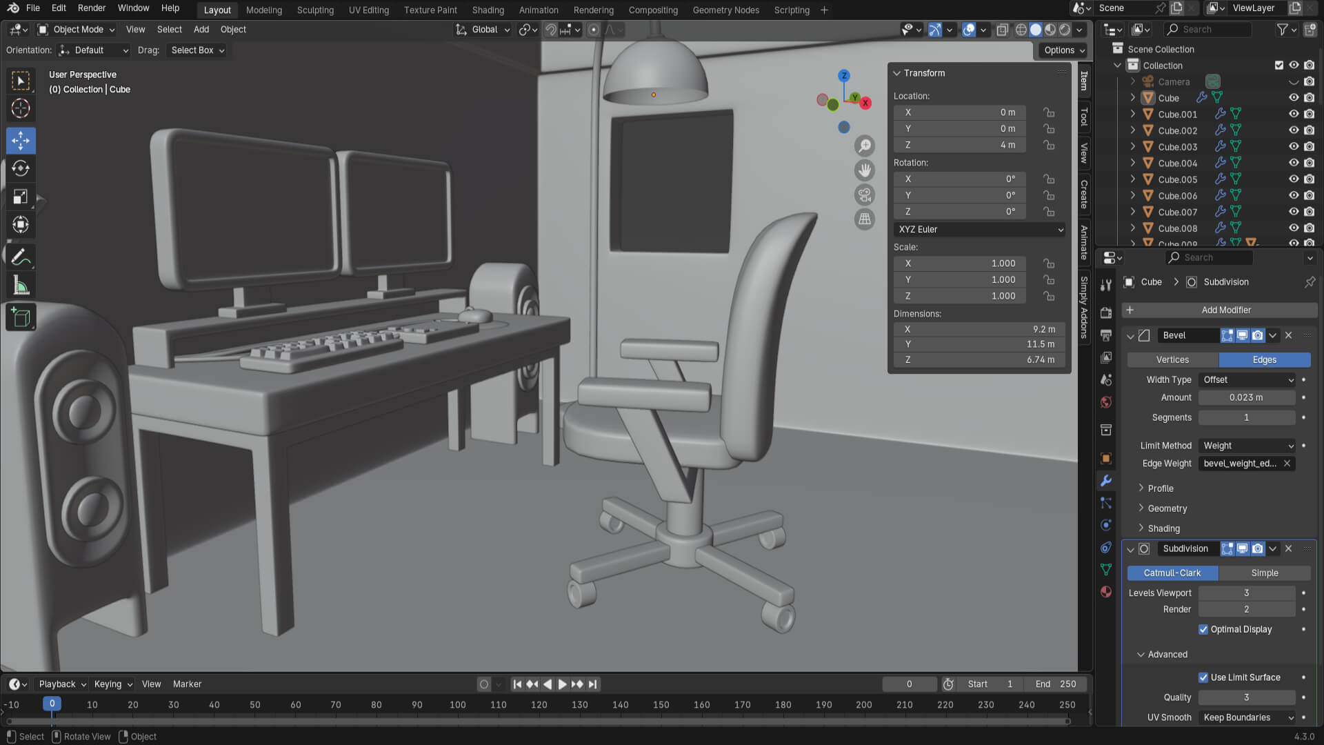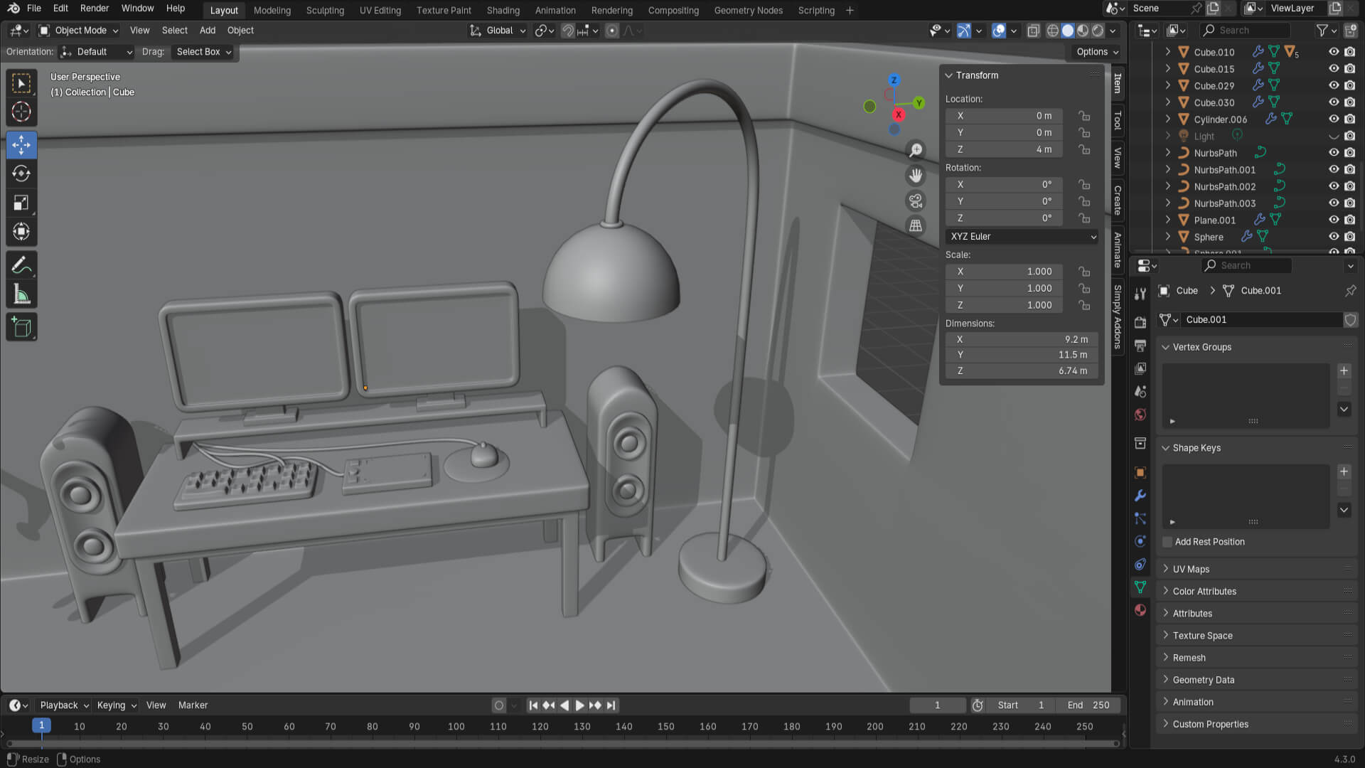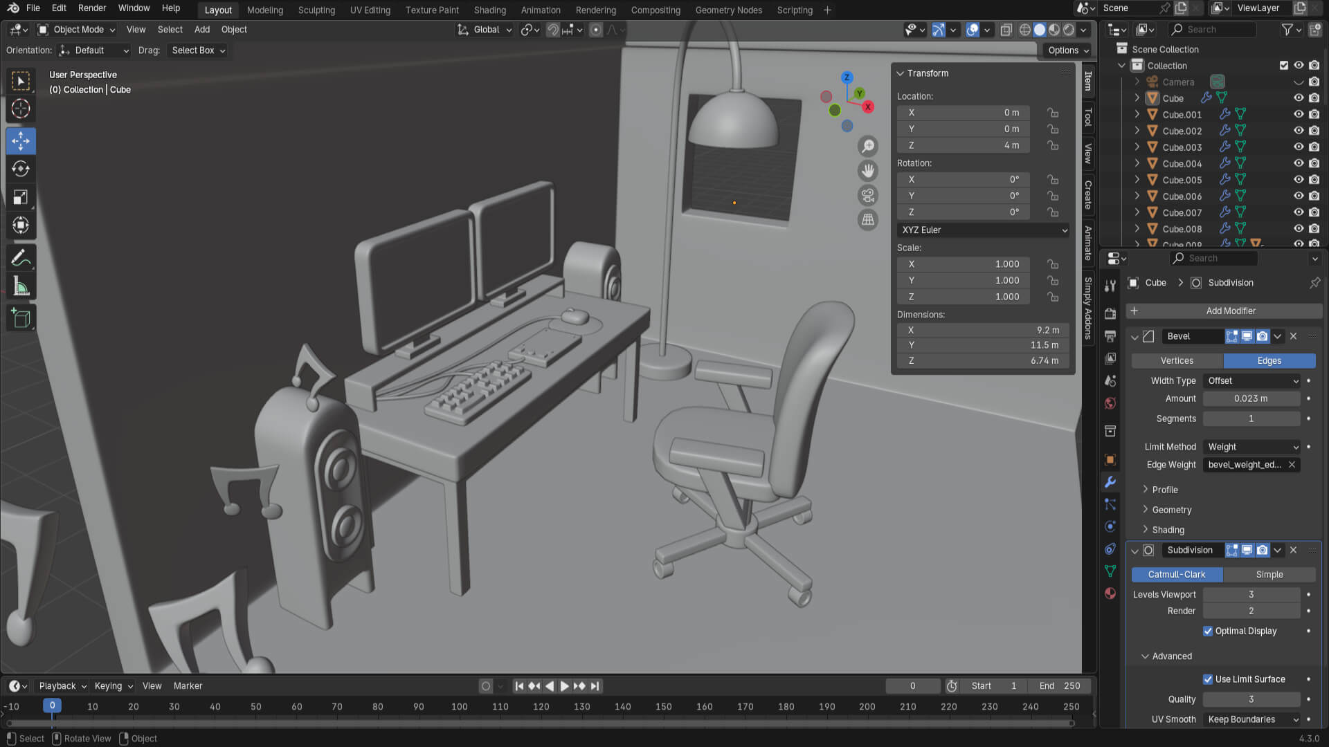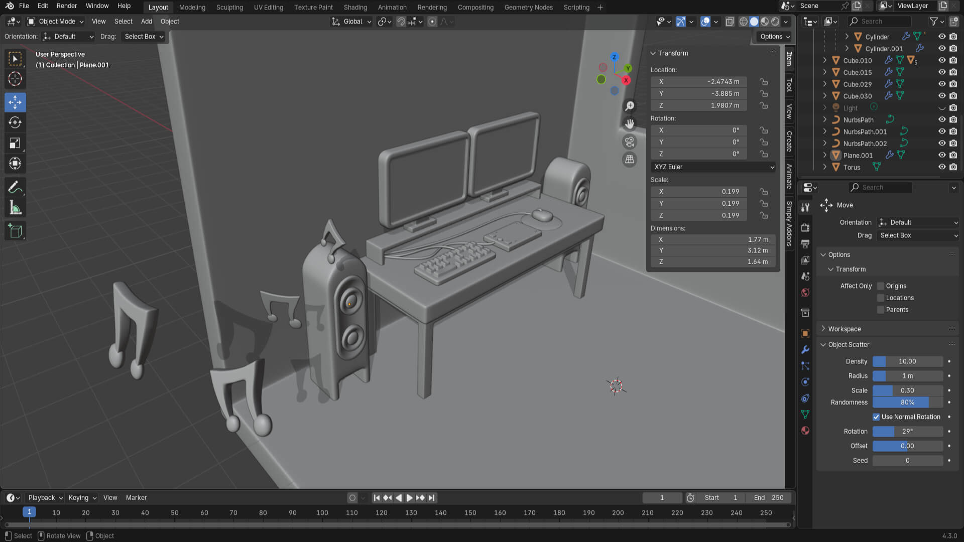 The next step was to model some speakers on the sides of the desk and add some floating musical notes to liven up the scene. Then I modeled a large lamp to further decorate the room.