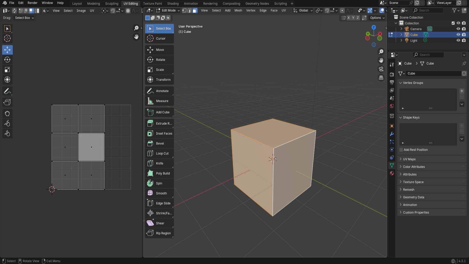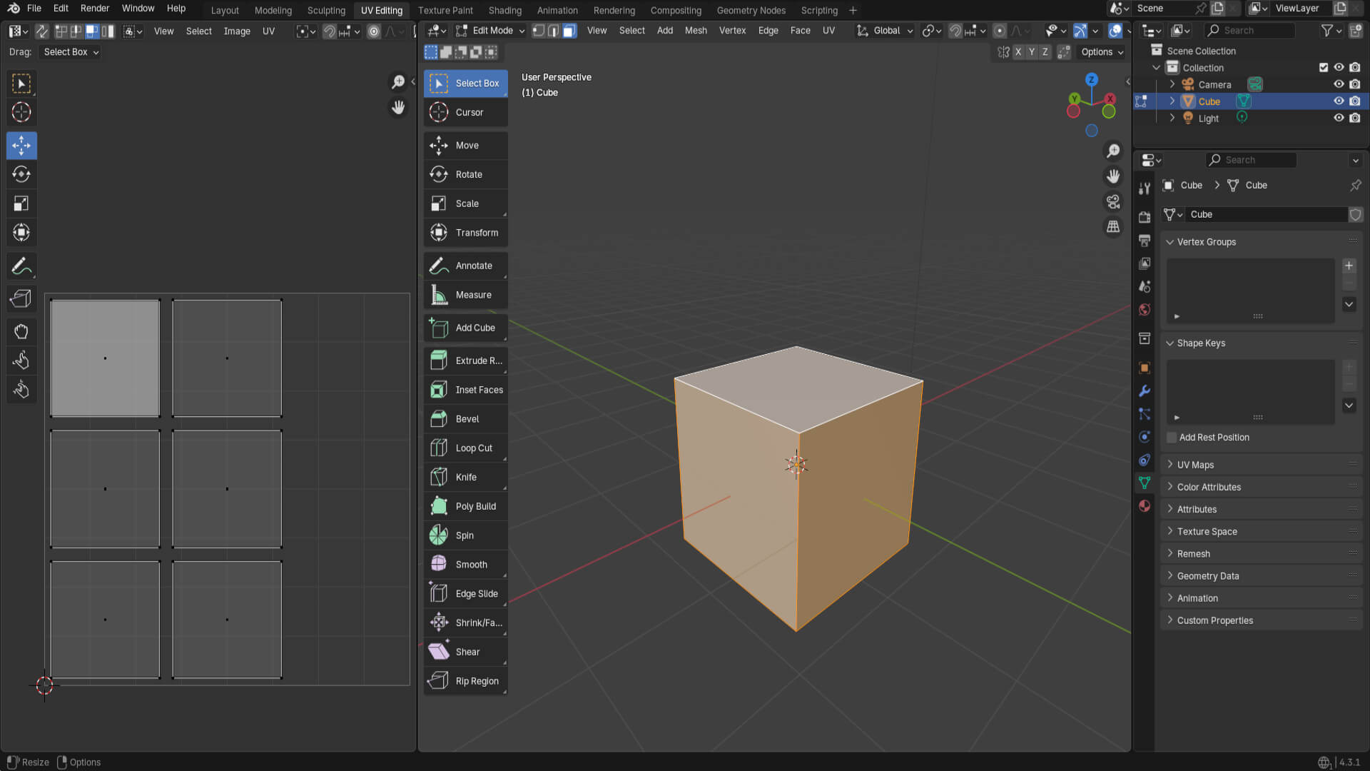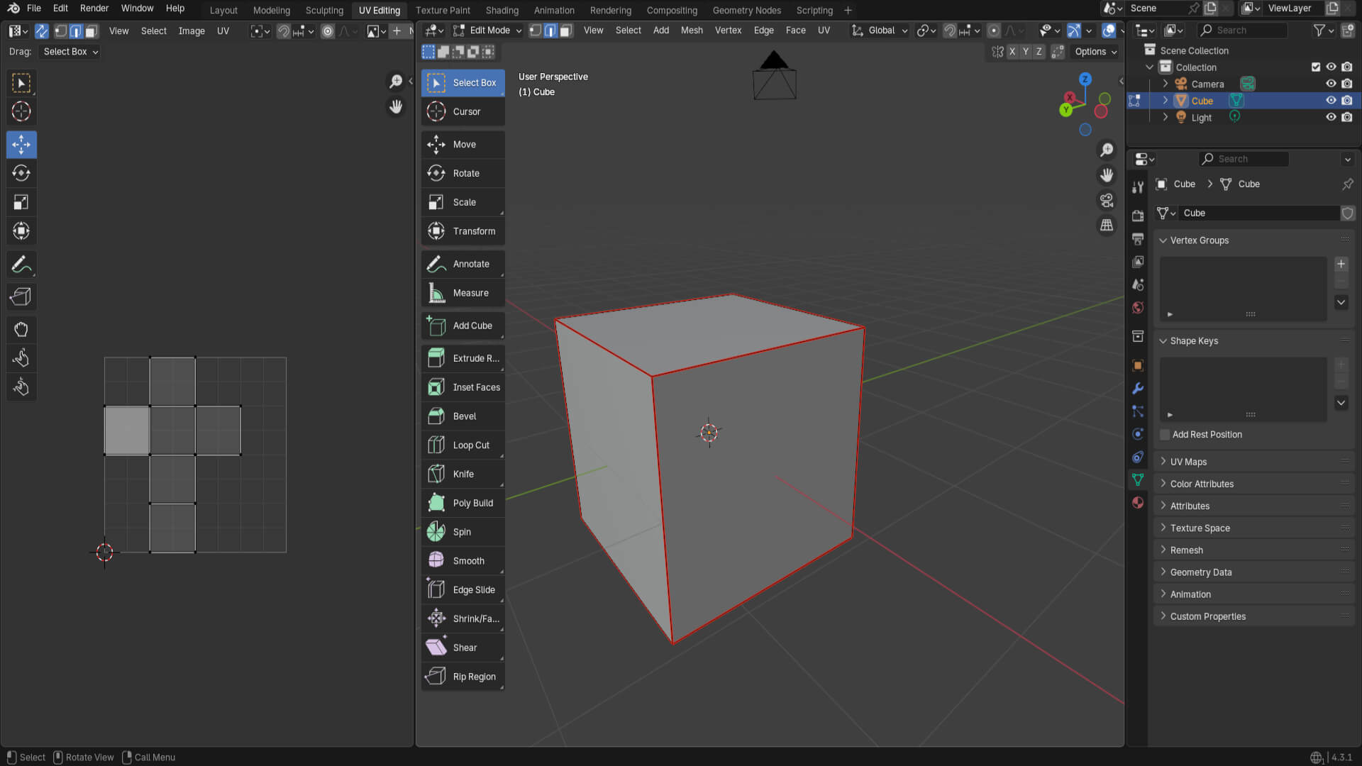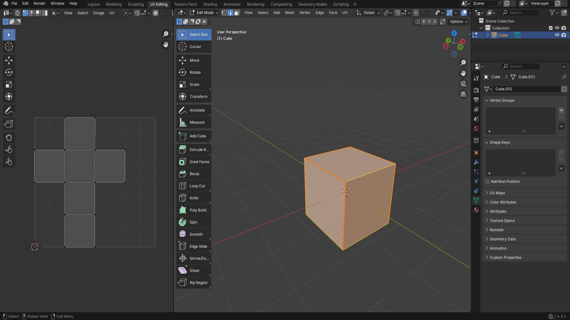 Then, I started learning the different cuts made to geometric shapes, the UV Editing interface in Blender, and how to stitch polygons in the texture.