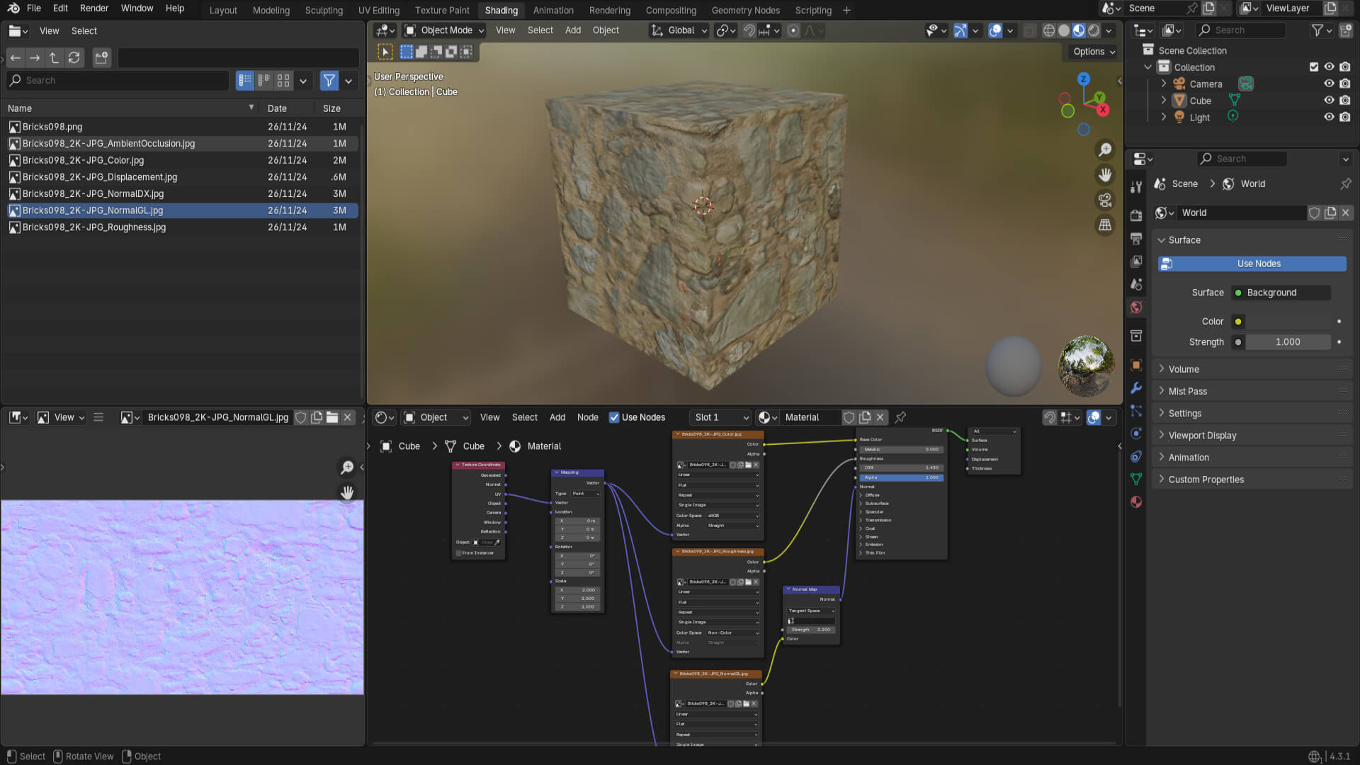 Lastly, and most important, the different layers that make the textures, such as Normal Map, Displacement, Ambient Occlusion, Roughness, and Color. By composing the texture with these, I was able to give volume and a realistic style, as in the case of this cube. To achieve this result, I had to experiment with Blender’s options, using ray tracing to achieve that effect.