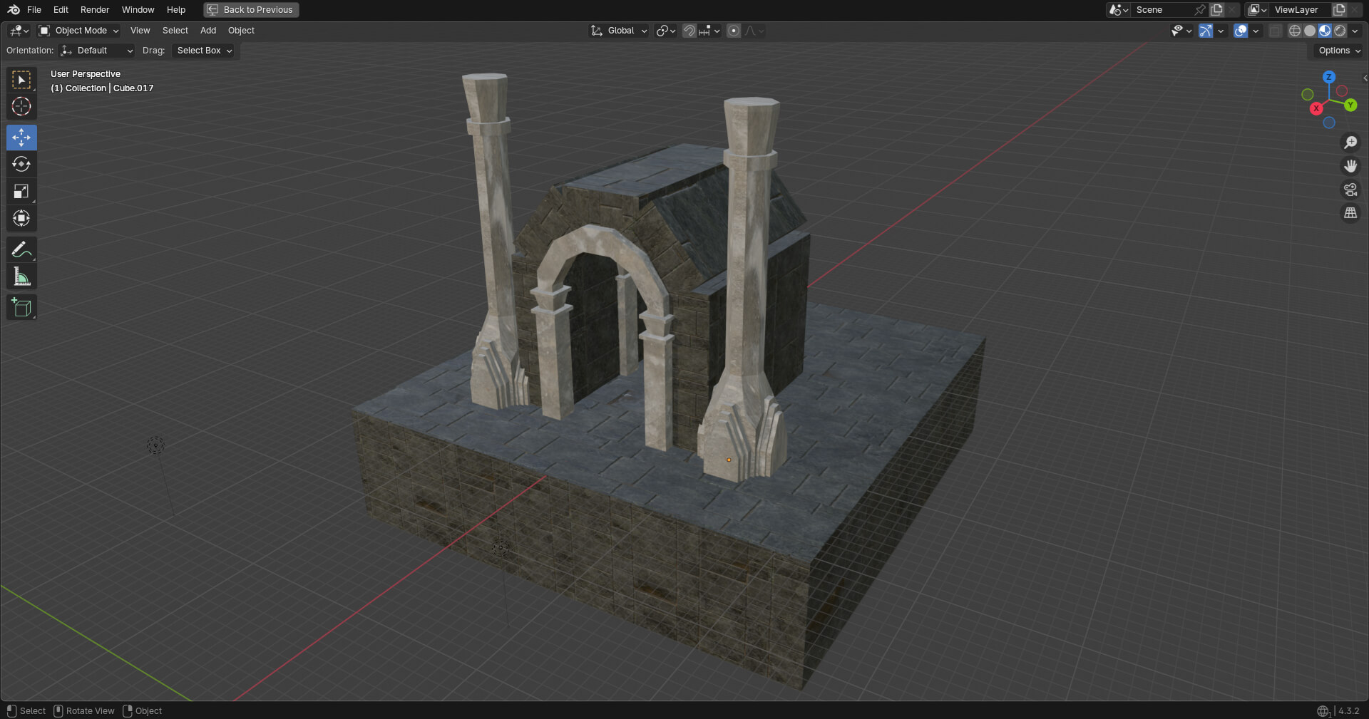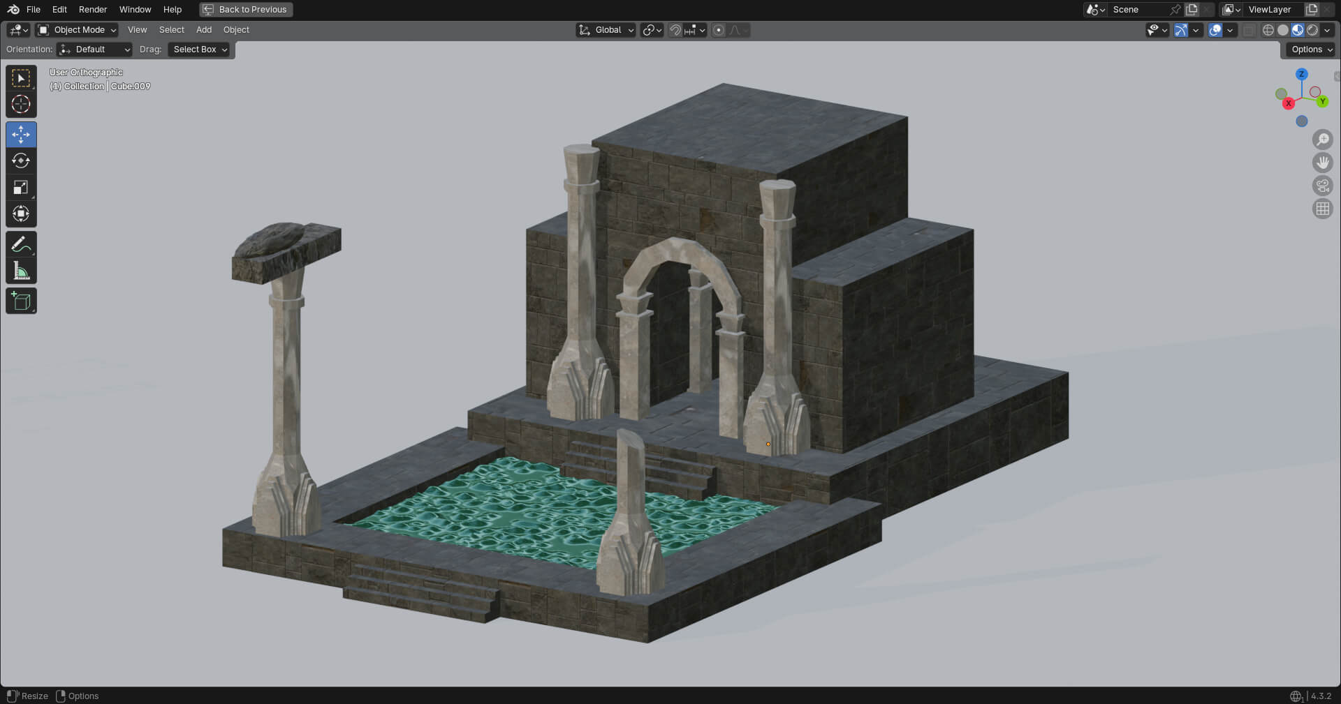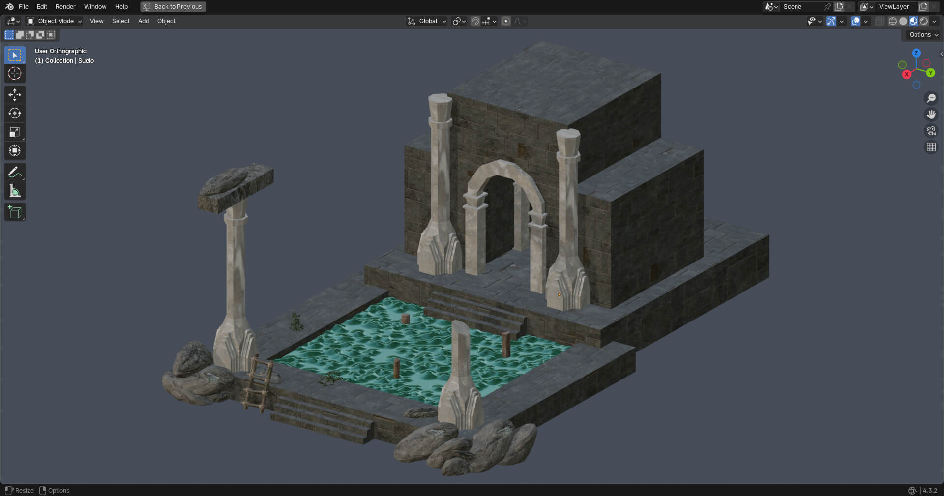 Continuing with the course, I made significant progress in the construction of this temple diorama. With the props created, it is time to start assembling the scene. First, I made the blocking of the temple, placing the floor, the exterior door, and the columns.