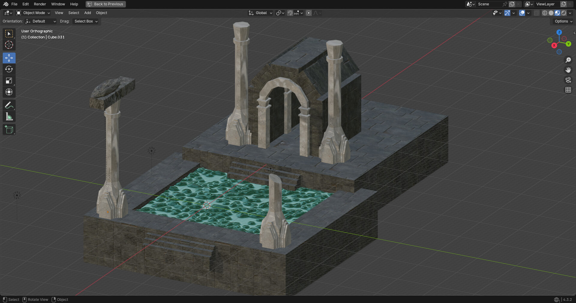 Then, using the floors, stone stairs, and different columns, I also created a pool at the entrance to give it a mystical touch. I also expanded the area at the temple entrance as well.