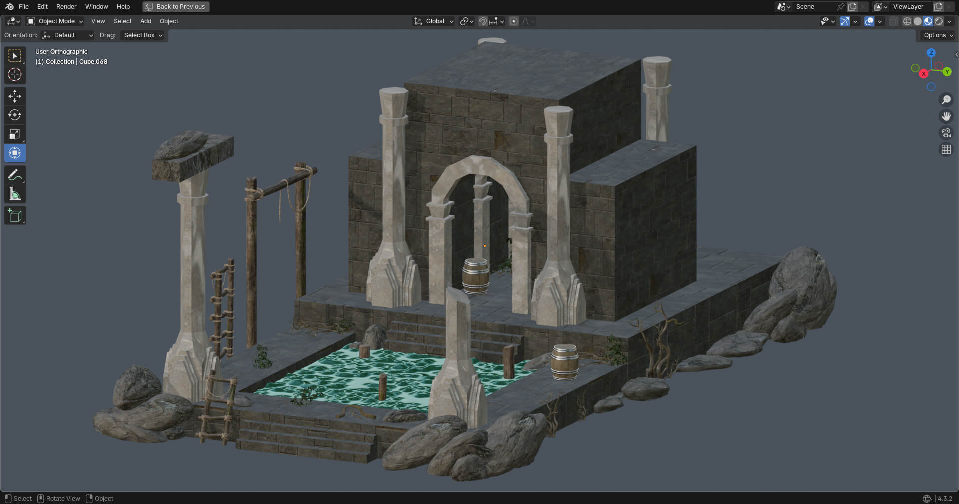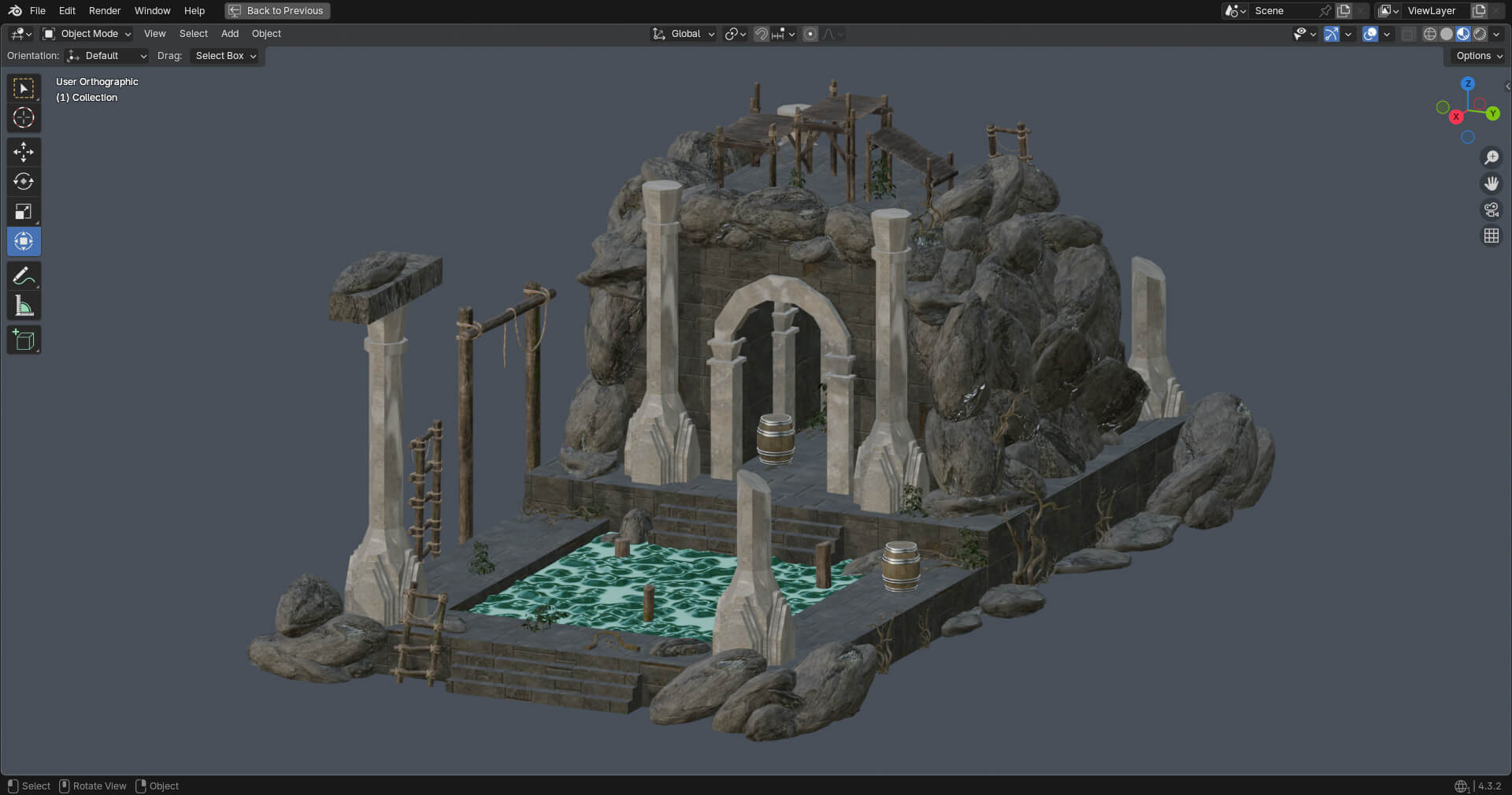 After that, using various props, I began to decorate the scene a bit, adding rocks, plants, stairs, and some posts of wood in the water. Later, I continued to bring life to the scene, this time with barrels, more rocks, roots, and columns.