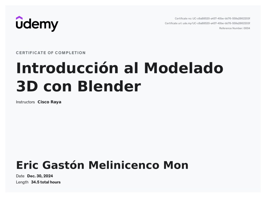 I completed the course: Introducción al Modelado 3D con Blender! It was a long and very satisfying journey, now I am going for more! It is a great achievement for me. Saying goodbye to the year 2024, having completed this course makes me feel so good. Now starting the next year, I will do another one and keep it learning a lot...